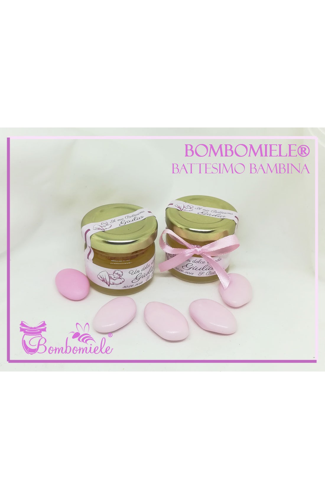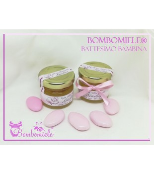 Vasetto di miele da gr 30, corrisponde circa a 4 cucchiai grandi di miele. Dimensioni del vasetto: diametro mm 45, altezza mm 50. Questo articolo comprende il vasetto di miele con l'etichetta personalizzata, spargimiele e fiocco come opzione.