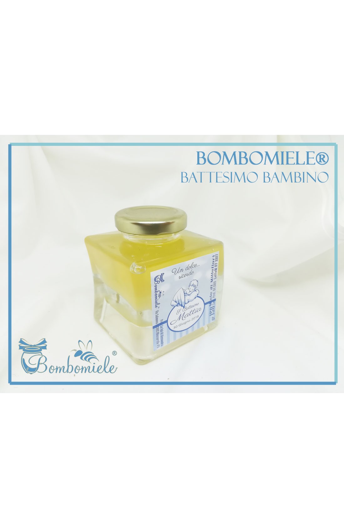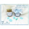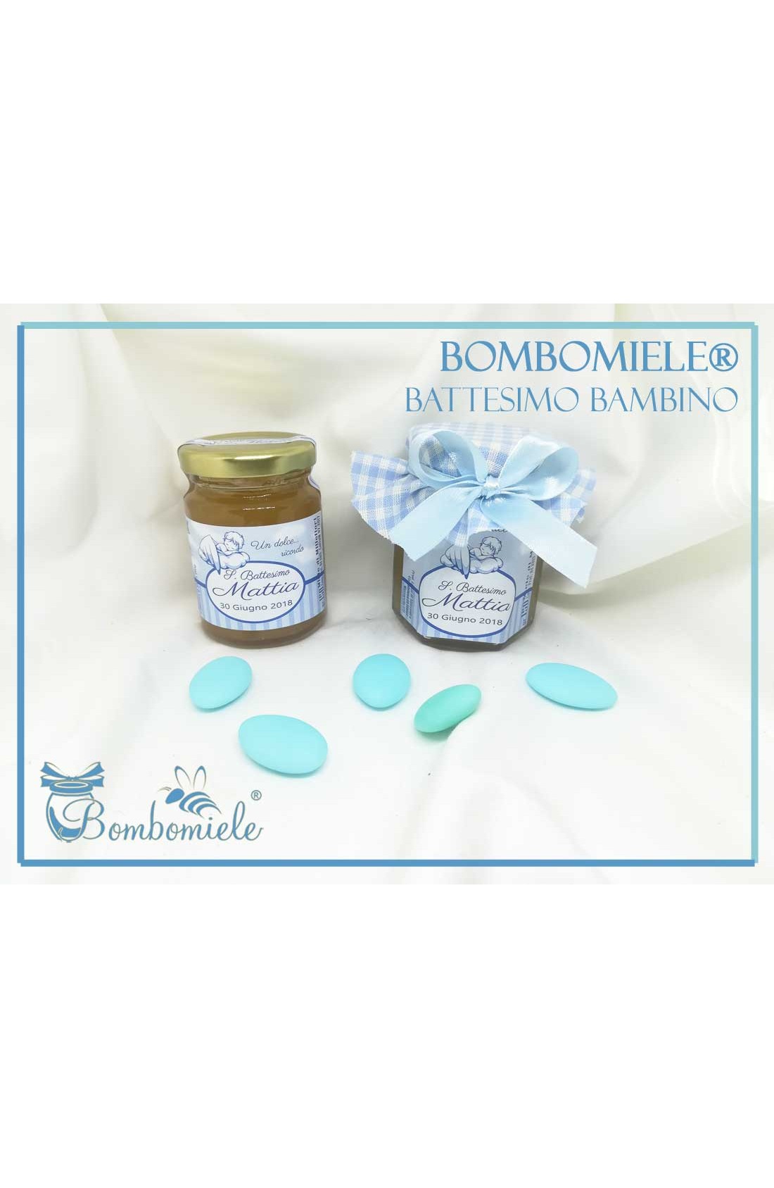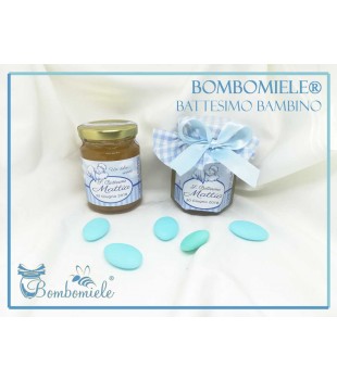 questo articolo comprende il vasetto di miele con l'etichetta personalizzata, la confezione con copritappo e opzionali i5 confetti e lo spargimiele.