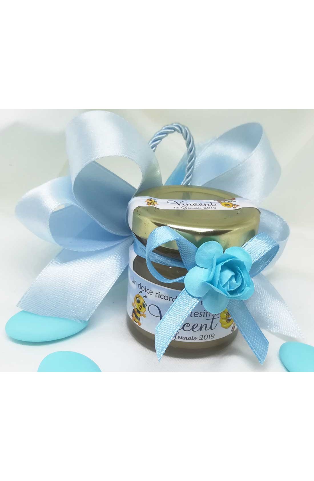 questo articolo comprende il vasetto di miele con l'etichetta personalizzata, la confezione con 5 confetti, sacchetto a farfalla, con doppio fiocco e cordino, fiorellino sul fiocco frontale, si può aggiungere lo spargimiele come opzione di acquisto.