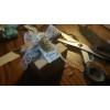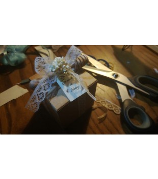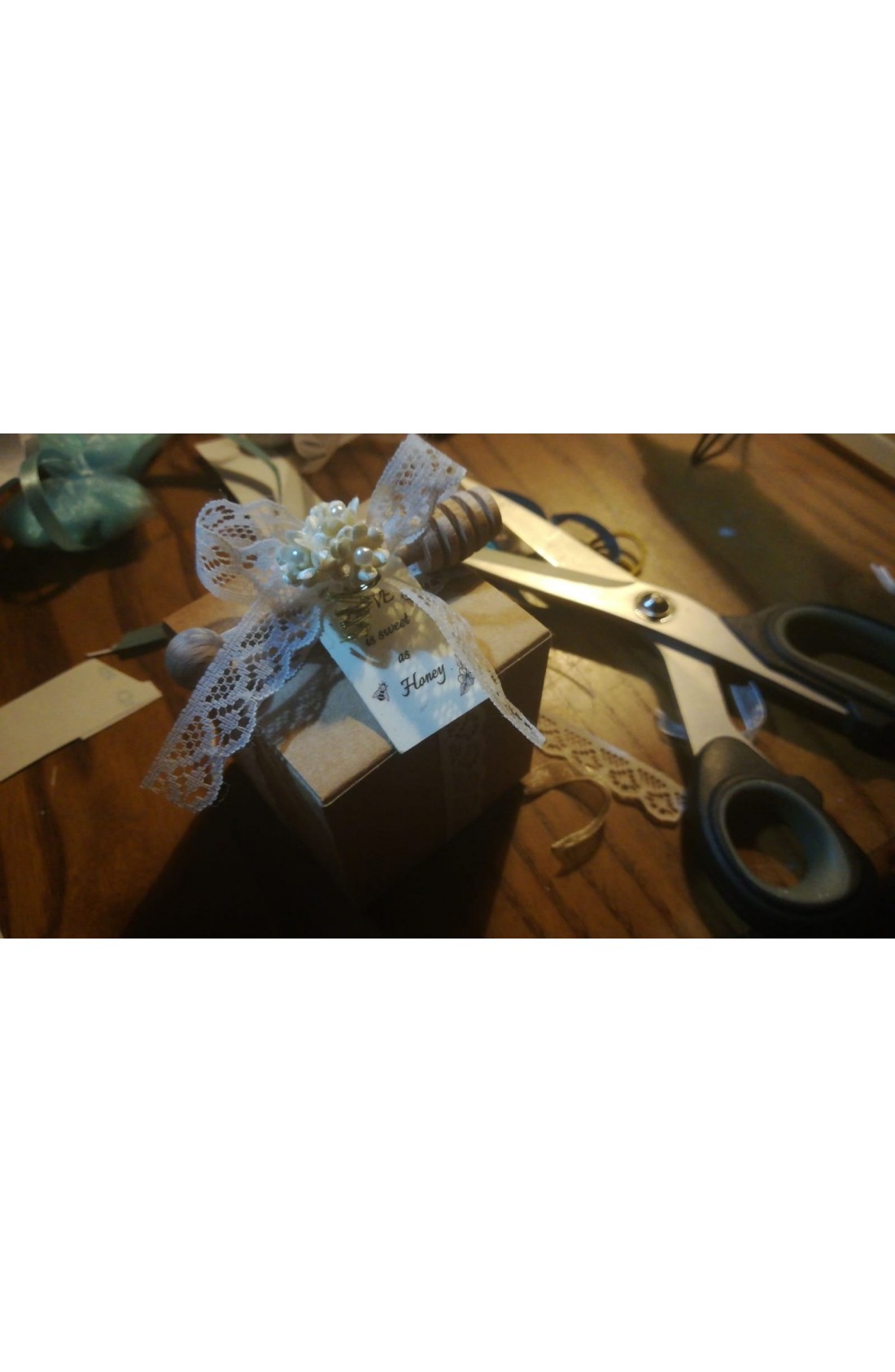 Vasetto miele gr 80 chiuso in una scatolina di cartoncino bianco o avana, nastro di colore a scelta, spargimiele e minitag con frase personalizzabile e cifre degli sposi, fiorellino e/o perline a decorazione.